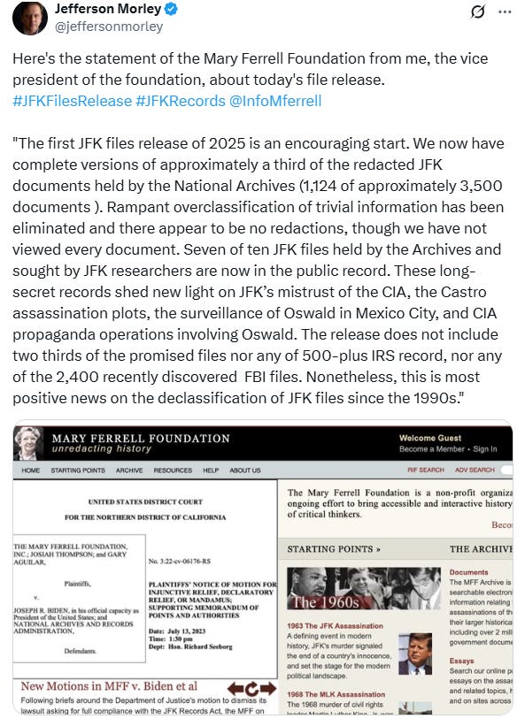 The document release is “an encouraging start,” Morley posted. But it’s just a start.