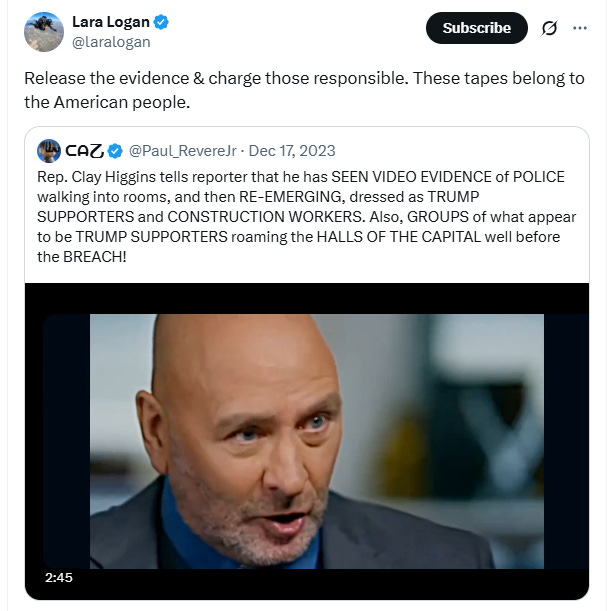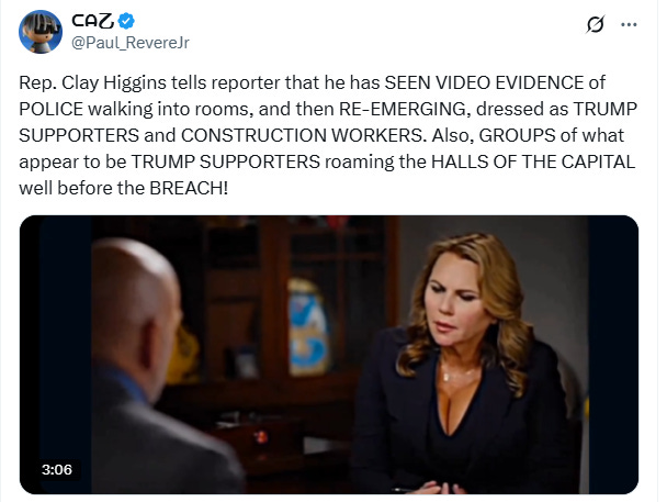 “Rep. Clay Higgins tells reporter that he has SEEN VIDEO EVIDENCE of POLICE walking into rooms, and then RE-EMERGING, dressed as TRUMP SUPPORTERS and CONSTRUCTION WORKERS,” CAZ posted on X.