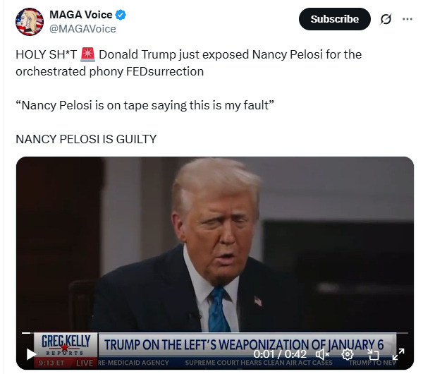 “HOLY SH*T Donald Trump just exposed Nancy Pelosi for the orchestrated phony FEDsurrection,” MAGA Voice posted on X.