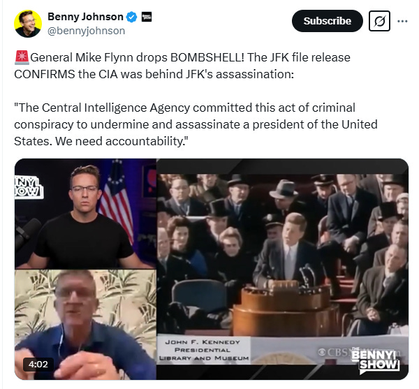 “The JFK file release CONFIRMS the CIA was behind JFK's assassination: ‘The Central Intelligence Agency committed this act of criminal conspiracy to undermine and assassinate a president of the United States. We need accountability.’”